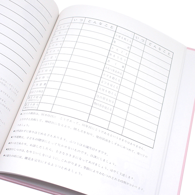 当社創業以来、かたくなに守りつづけている育児記録の元祖です。 生後1ヶ月までは毎日。生後1ヶ月から12ヶ月までは、1ヶ月ごと、1才以降は4才までの各年齢、お祝い行事、保育園・幼稚園などで書き込みスペースがあります。