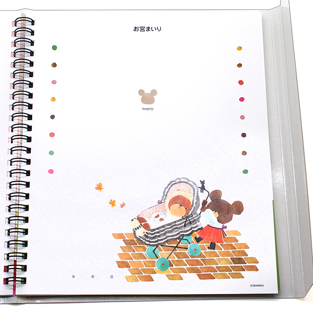 | 14-15 | お祝いメッセージ | 16-17 | 家族 お宮参り | 18-19 | 初節句 お食い初め | 20-21 | フリーページ | 22-23 | はいはい いたずら | 24-27 | 1歳のお誕生日 | 28-29 | 好きなこと 面白かった出来事 | 30-31 | 大変だったこと お出かけ | 32-33 | おしゃれ はじめての水着 | 34-35 | 友だちと一緒に 家族と一緒に | 36-37 | お気に入りのおもちゃ 笑顔・泣き顔 | 38-39 | クリスマス | 40-41 | お正月 | 42-45 | フリーページ | 46-47 | 成長の記録 病気・予防接種 | 49-58 | 写真ポケット | 59-60 | ポケット |
